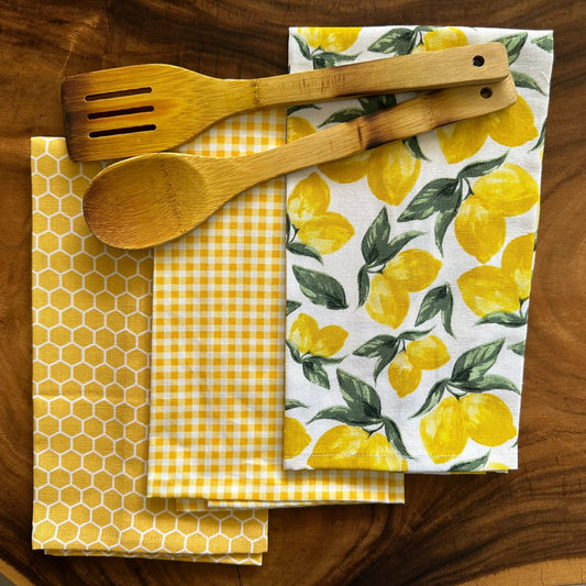 Oak & Lily Kitchen Towels – Honeycomb, Lemon & Yellow Checks | Set of 3 | 100% Cotton | Super Absorbent | Premium Quality