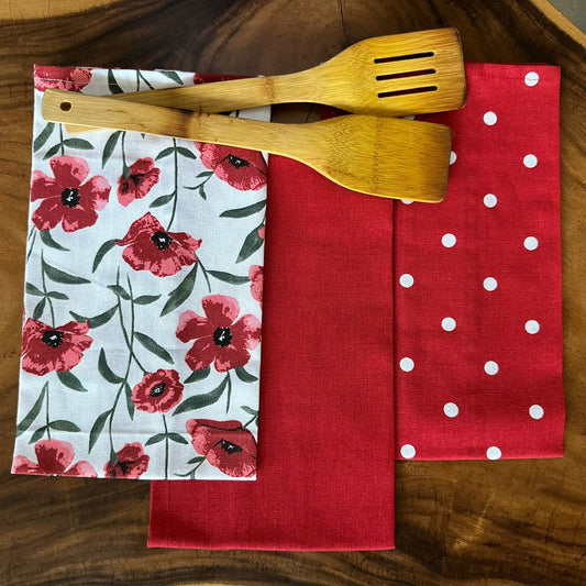 Oak & Lily Kitchen Towels – Red Poppy Flower, Red Polka Dot & Solid Red | Set of 3 | 100% Cotton | European Quality | Super Absorbent & Anti-Bacterial