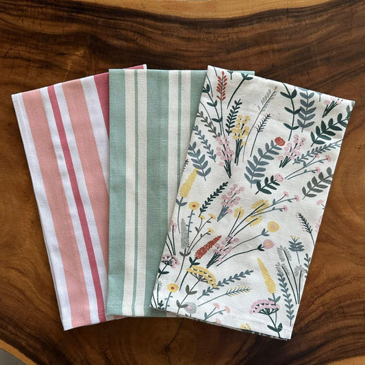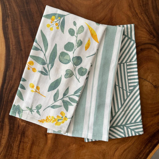Oak & Lily Kitchen Towels – Sage Green & Yellow Flowers, Stripe & Geometric | Set of 3 | 100% Cotton | European Quality | Super Absorbent & Anti-Bacterial