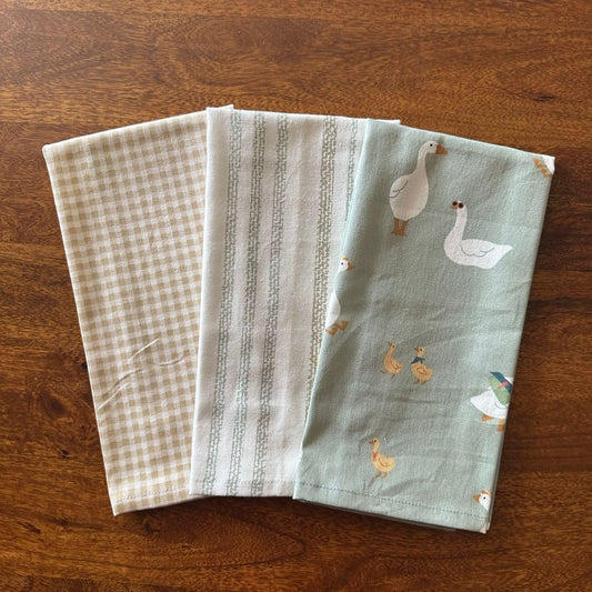 Oak & Lily Kitchen Towels – Green Duck, Stripes & Check Prints | Set of 3 | 100% Cotton | Super Absorbent | Premium Quality