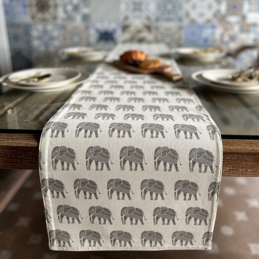 Oak & Lily Table Runner – Grey & Ivory Elephant Print | 100% Cotton | Premium European Quality