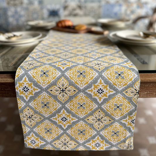 Oak & Lily Table Runner – Yellow & Grey Ethnic Print | 100% Cotton | Heat Resistant | Premium European Quality