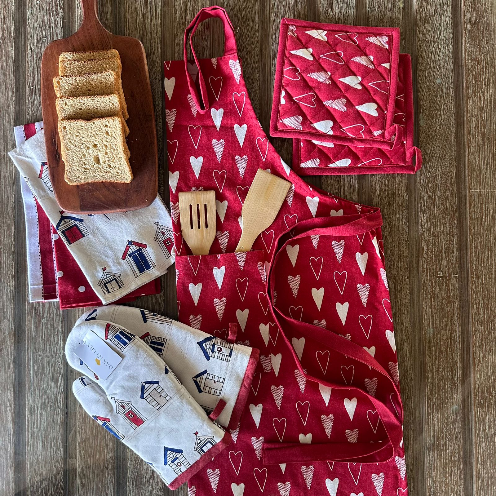 Oak & Lily Kitchen Combo – Red Hearts Apron, Pot Holders with Sailor Hut Mittens | 100% Cotton | Heat Resistant | European Quality