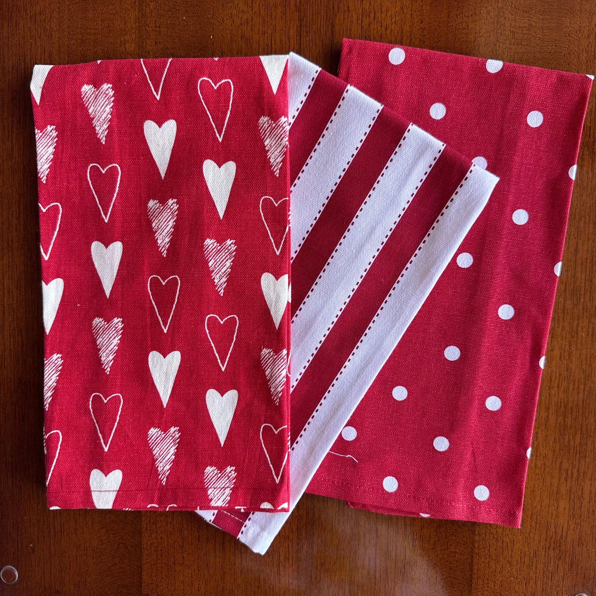 Oak & Lily Kitchen Towels – Red Heart Print, Red Polka Dot & Red Stripe | Set of 3 | 100% Cotton | European Quality | Super Absorbent & Anti-Bacterial